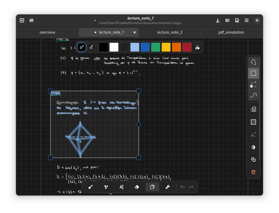 Rnote 是一款基于矢量的开源绘图应用程序,用于绘制草图、手写笔记以及注释文档和图片。它面向学生、教师和拥有绘图板的用户,提供 Pdf 和图片导入和导出、无限画布以及适用于大小屏幕的自适应 UI 等功能。